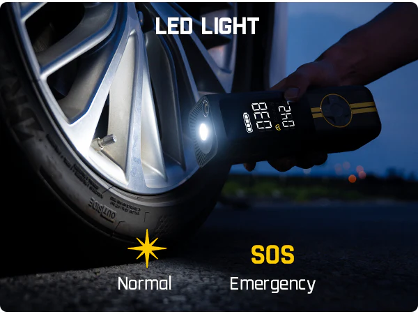 Emergency Preperation Tool. If you are going to get stung by a flat tire then odds are it will be at night. That is why the Liberty Air Ultra has a built-in high powered flood light to light up the work area and keep you safe. Need urgent help? Click a button and turn on the SOS strobe light.