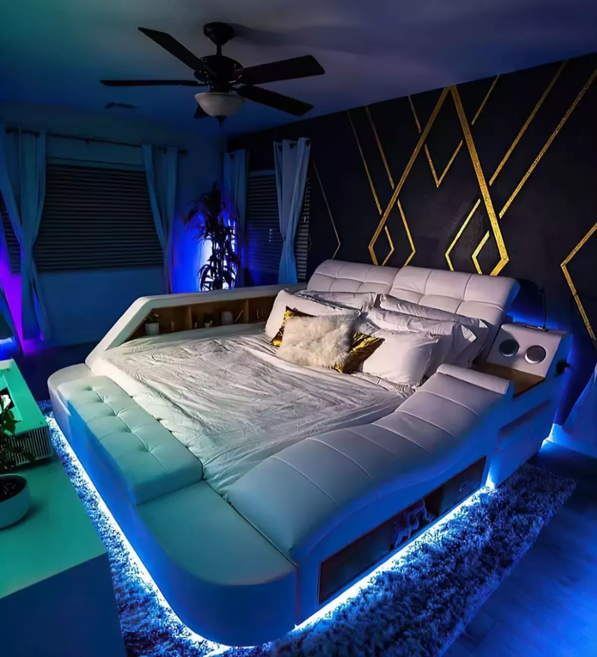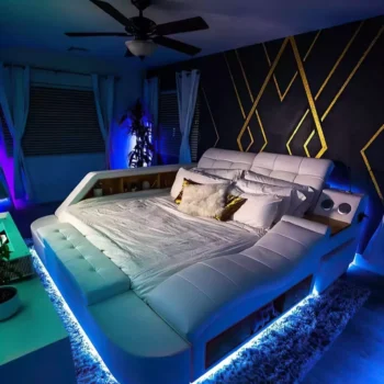 This bed, my friends, is the ultimate in luxury and convenience. It's like having your very own personal spa right at home! After a long day of hustling and bustling around town, sinking into this bed feels like pure bliss. Can we talk about that built-in massage feature? It's simply divine! No need to shell out big bucks for a professional masseuse or even get off your comfy spot. Just click a button and let the magic begin. You can feel all those knots untwisting from your tired muscles as you lay back and relax – it's just what the doctor ordered. And then there are the Bluetooth speakers – oh boy! They deliver such quality sound; it makes listening to my favorite podcasts an absolute joy. Whether I'm winding down with some soothing music or catching up on the latest news, these speakers make everything sound better than ever before. But wait, there's more! This bed isn't just about comfort; it also helps keep things neat and tidy with its ample storage space. Gone are the days when I'd be scrambling around looking for that missing sock or trying to find a place to stash away extra pillows and blankets. With this handy storage feature, everything has its place, making cleaning up less of a chore. Oh, and I added some LED lights to the setup, and let me tell you – it looks incredible. The lights just tie everything together, giving the room a cozy, ambient glow. It’s the perfect finishing touch and makes the bed feel even more luxurious. So yeah, if you're thinking about investing in something that offers both comfort and practicality – look no further than this beauty here! It’s got all bases covered: relaxation after tiring days with top-tier massages, crystal-clear sounds from high-quality speakers, plenty of storage space to keep everything organized, and now, a stunning LED glow that takes the whole experience to the next level. Now isn’t that what dreams are made of?