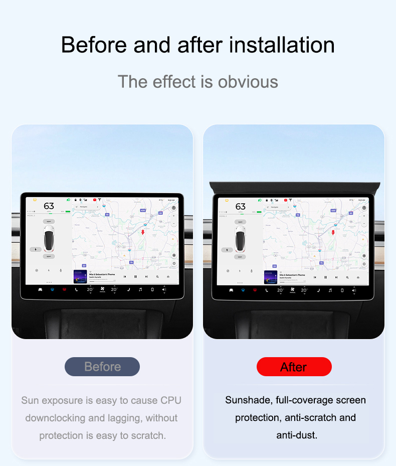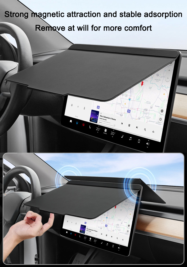 Keep your Tesla Model 3/Y 2021-2024 screen in pristine condition with this Sunshade Screen Protector. This sleek, minimalist protector offers ultimate protection against UV rays, dust, and scratches, all while maintaining a modern, elegant look for your car’s interior. Designed for convenience, this cover is easy to install and remove, making it an essential accessory for Tesla owners.